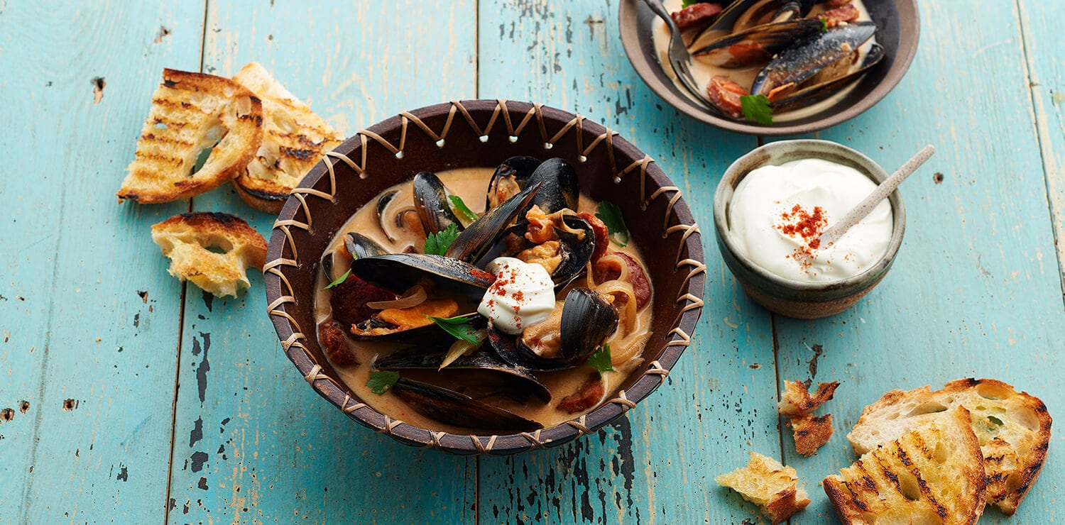 Ladle mussels into serving bowls and top with an extra dollop of yogurt.