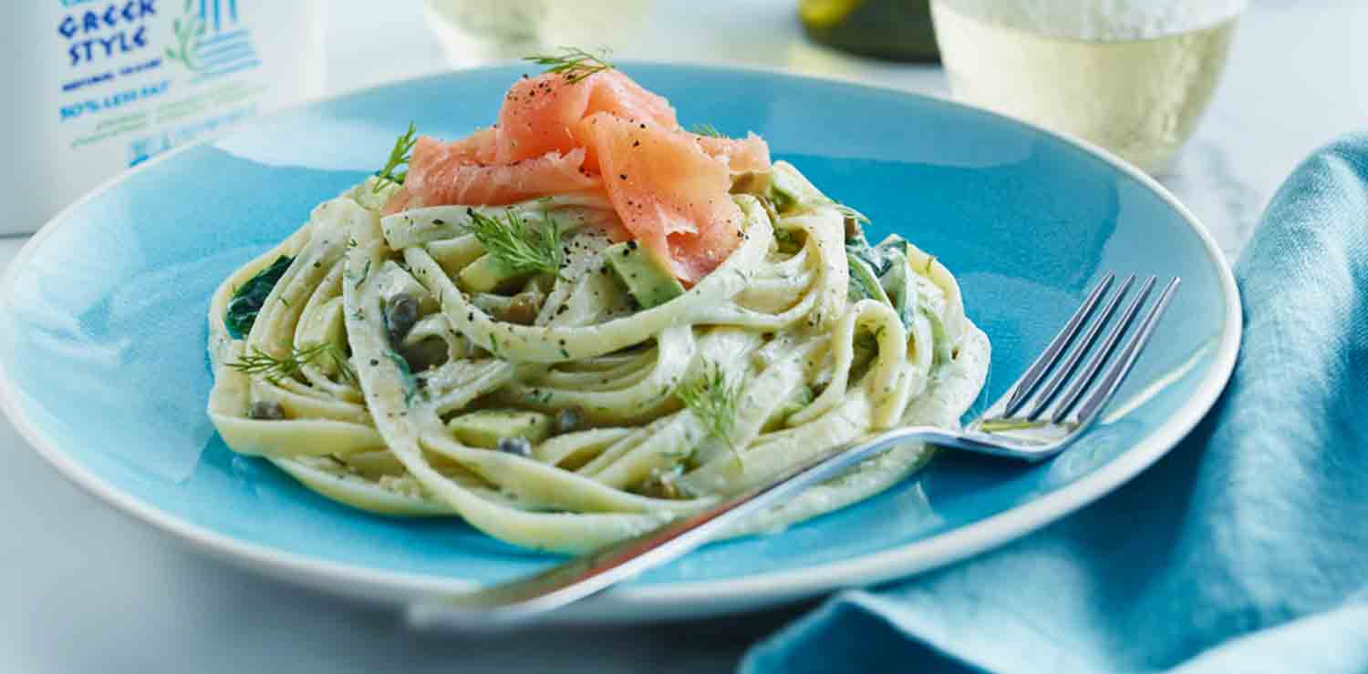 Cook the pasta in a pot of salted boiling water until al dente. Meanwhile, mash half the avocado and combine with Farmers Union Light Greek Style Natural Yogurt, dill and salt. Dice the remaining avocado.